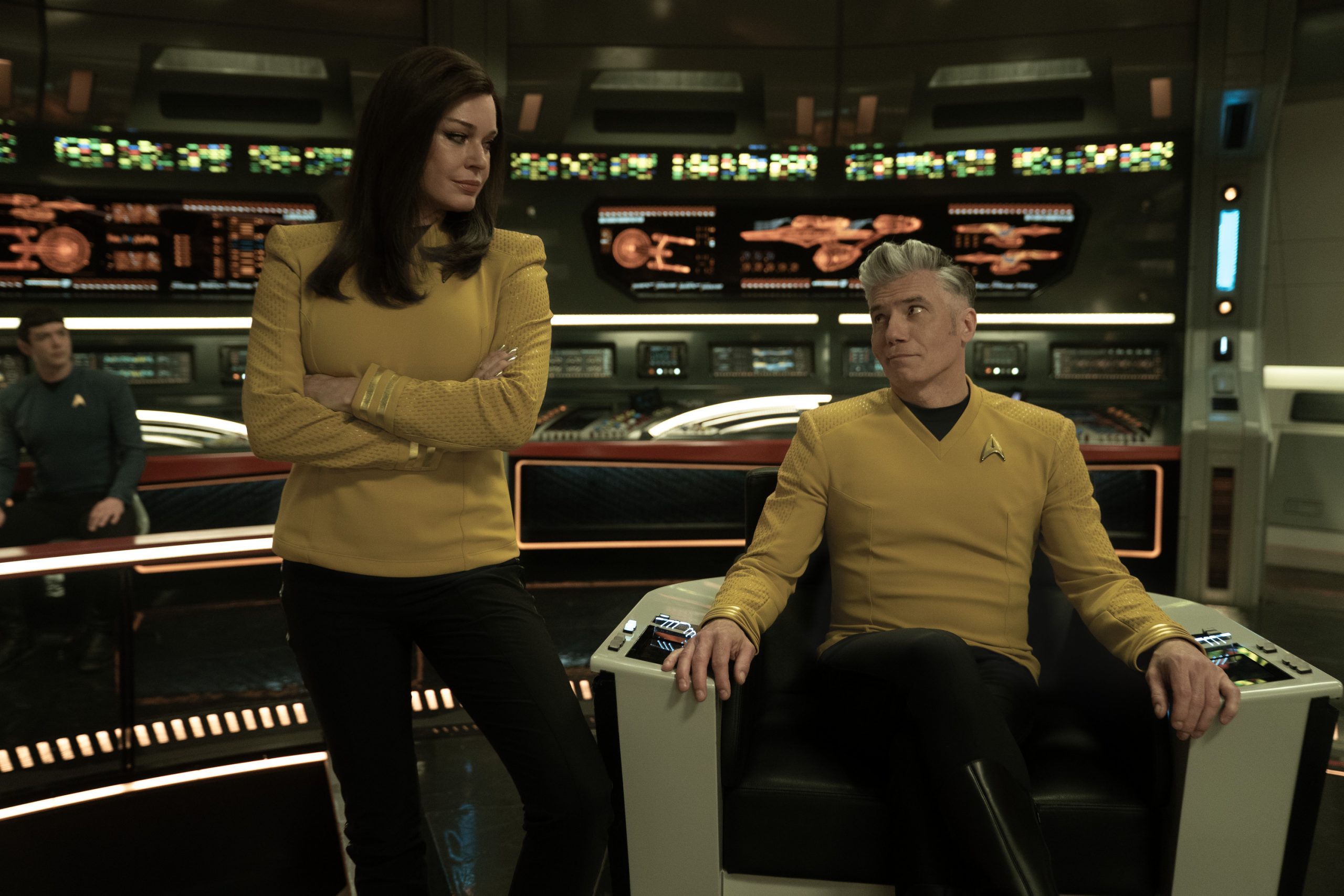 Rebecca Romijn as Una and Anson Mount as Capt. Pike in season 3, Episode 10 of Strange New Worlds streaming on Paramount+. Photo Credit: Marni Grossman/Paramount+